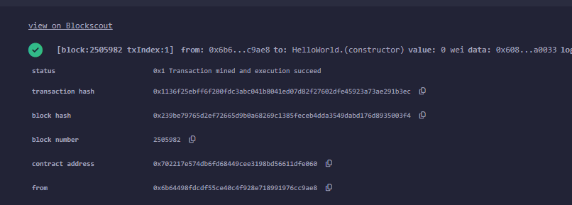 Bước 6: Khi Deploy xong nó sẽ trả về 1 transaction hash các bạn copy transaction hash đó quay lại trang Quests để xác nhận làm xong cho Quest Deploy a smart contract này nhé